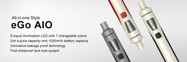 eGo AIO, being all-in-one style, attaches the best anti-leaking structure with 2ml e-juice capacity. It applies childproof systems: pressure twist cap of tank and five-click fire button of power supply. It is simple and convenient in use, but fashionable in look of several mixed colors and indicator light of seven colors. Its simplicity and efficiency make the device quite popular and unique.
