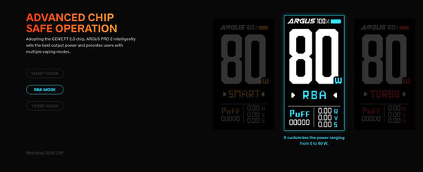 With the TURBO mode, Argus Pro 2 provides a remarkable 25% increase in vapor volume in one second. Adopting the GENE. TT 2.0 chip, Argus Pro 2 intelligently sets the best output power and provides users with multiple vaping modes. The distinctive top-airflow design effectively controls e-liquid and condensate leaking, which also brings a long aftertaste and lasting flavor combined with PnP X coils.