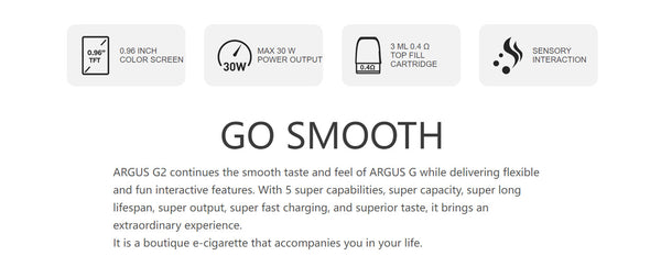 Argus G2 continues the smooth taste and feel of Argus G while delivering flexible and fun interactive features. It provides 3 UI interface choices and presents 3 animations including flames, flying saucers, and colorful cups with 3 power adjustment modes (Smart, Super, and ECO). Argus G2 Kit comes with a fully upgraded new cartridge, the Argus Top Fill Cartridge that features a 3ml capacity, 30-day without leakage, 90ml coil lifespan. Besides, it is also compatible with Argus Pod Family Devices (Side-fill Argus Pod 1.2ohm/0.7ohm). Designed with iCOSM CODE, VOOPOO Argus G2 will bring you a diverse vaping experience from MTL to RDL. Featuring 1000mAh built-in battery, it can provide long-lasting power for up to 30W.