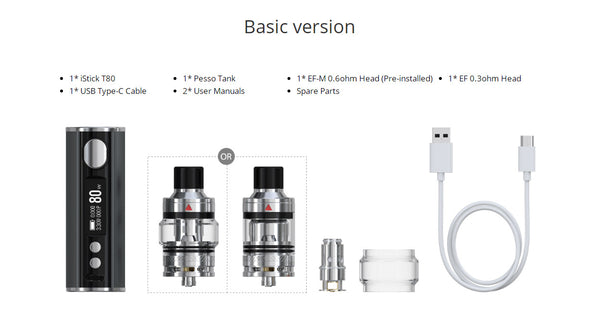 Eleaf iStick T80 Kit consists of the iStick T80 Battery and a Pesso atomizer. It is powered by built-in 3000mAh battery, which can fire up to the max output of 80W. With the oversized fire button on the side, which is easy to operate. It also has large an intelligent screen to display the vaping data clearly. The include Pesso atomizer features 5ml e-juice capacity for your options. It adopts easy top filling design and adjustable bottom airflow system to bring you larger cloud of vapor. It compatible with both E-liquid and nicotine salt, bringing smooth taste and optimal flavor. It adopts the all-new EF coils for huge clouds and intense flavor. With multiple protections, it will guarantee a safe vaping environment to you.