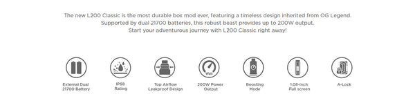 Geekvape L200 Classic 200W Kit, featuring a 5-200W output range, Z MAX Tank pairing, and utilizes dual 21700 batteries. Constructed from durable zinc-alloy, the chassis of the Geekvape L200 Classic...