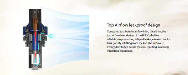 Compared to a bottom airflow inlet, the distinctive top airflow inlet design of the BFC Coil offers reliability in preventing e-liquid leakage issues due to tank gap. By inletting from the top, the airflow is evenly distributed across the coil, resulting in a stable inhalation experience.