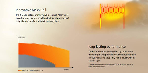 The BFC Coil utilizes an innovative mesh wire. Mesh wires provide a larger surface area than traditional wires to heat e-liquid more evenly, resulting in a strong flavor.