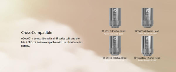 eGo AIO 2 is compatible with all BF series coils and the latest BFC coil is also compatible with the old eGo series battery.