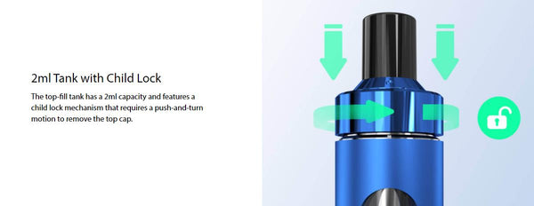 The top-fill tank has a 2ml capacity and features a child lock mechanism that requires a push-and-turn motion to remove the top cap.