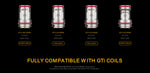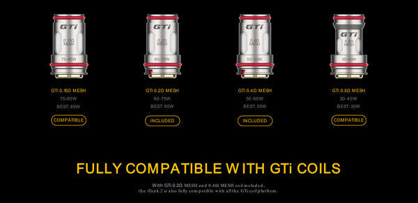 Coil Resistance: GTi 0.2ohm Mesh Coil (60-75W), GTi 0.4ohm Mesh Coil (50-60W)