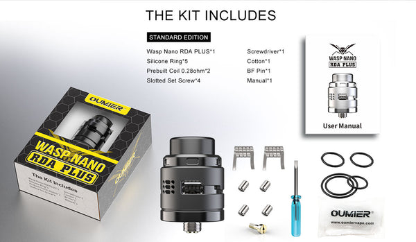 The WASP NANO RDA PLUS version . with its stylish colour scheme and optimised design 24mm diameter compact in size and easy to carry . The innovative dual coil building deck design greatly enhances the vaping experience.