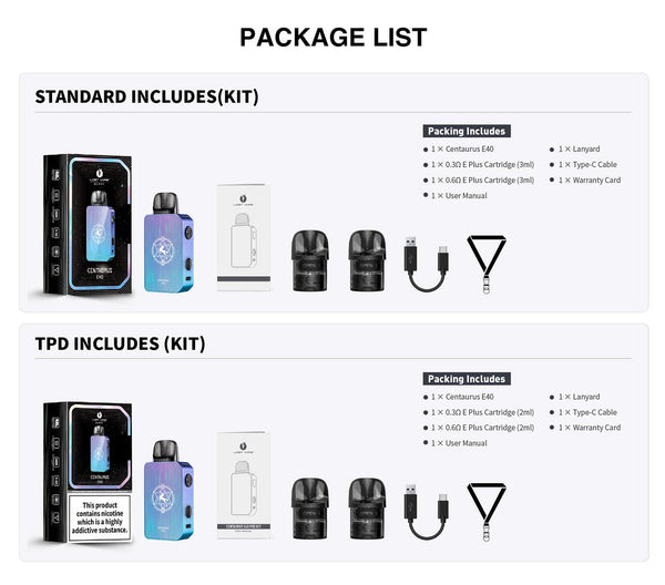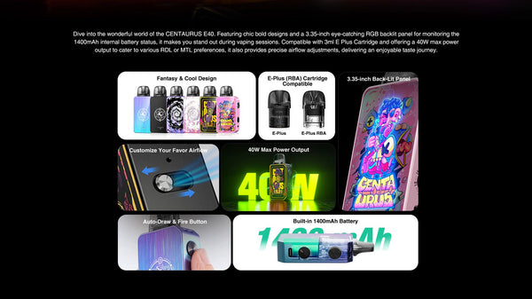 Lost Vape Centaurus E40 Pod Kit is equipped with a robust 1400mAh battery, Dive into the wonderful world of the CENTAURUS E40. Featuring chic bold designs and a 3.35-inch eye-catching RGB backlit panel for monitoring the 1400mAh internal battery status , it makes you stand out during vaping sessions . Compatible with 3ml E-Plus Cartridge and offering a 40W max power output to cater to various RDL or MTL preferences , it also provides precise airflow adjustments , delivering an enjoyable taste journey.