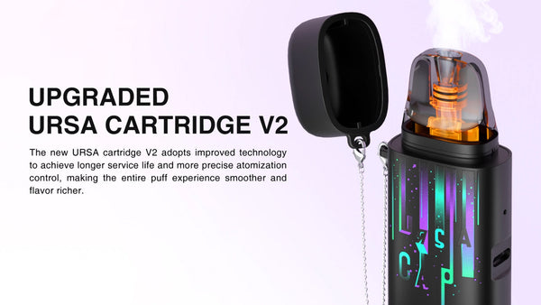 Lost Vape Ursa Cap comes with 2.5ml vape juice volume, a 1000mAh rechargeable battery as the power source, and a unique anti-dust cap for carefree vaping. Lost Vape Ursa is incredibly compact, as large as a lipstick. What's more, the cartridge's built-in 0.8 ohm resistance ensures dense, flavorful vapor. It can hold 2.5ml e-juice thanks to the Ursa Pod Cartridge V2. There is an indicator light that displays battery status with different colors. The special dustproof cap is also equipped with a chain so that you will not lose it. Lost Vape Ursa Cap offers best MTL vaping experience with 25W max output.