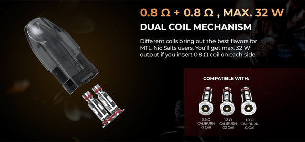 Caliburn Explorer Kit is Uwell's first dual-coil mechanism pod system kit. It is powered by a built-in 1000mAh battery with 32w max and Type-C charging to bring you long-lasting vaping....